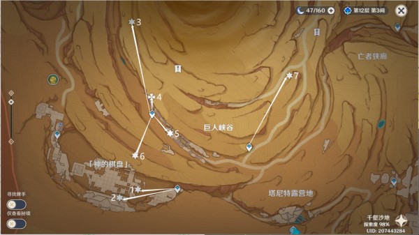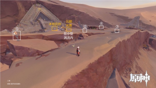 2、千壑沙地第6个火把的位置在神的峡谷的右上角,来到山坡上面吹散小型涡流拾取元能光锥,找到触碰并本相元件,靠近并点燃4个火把即可完成解密。